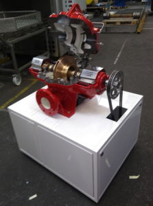 We hebben de pomp op een mooie verrijdbare showcase gepresenteerd die stevig genoeg is om het gewicht van de pomp te dragen. Daarnaast hebben we de pomp een draaiende opstelling gegeven waardoor de klant goed kan zien wat er draait in de pomp in bepaalde een bedrijfssituatie.